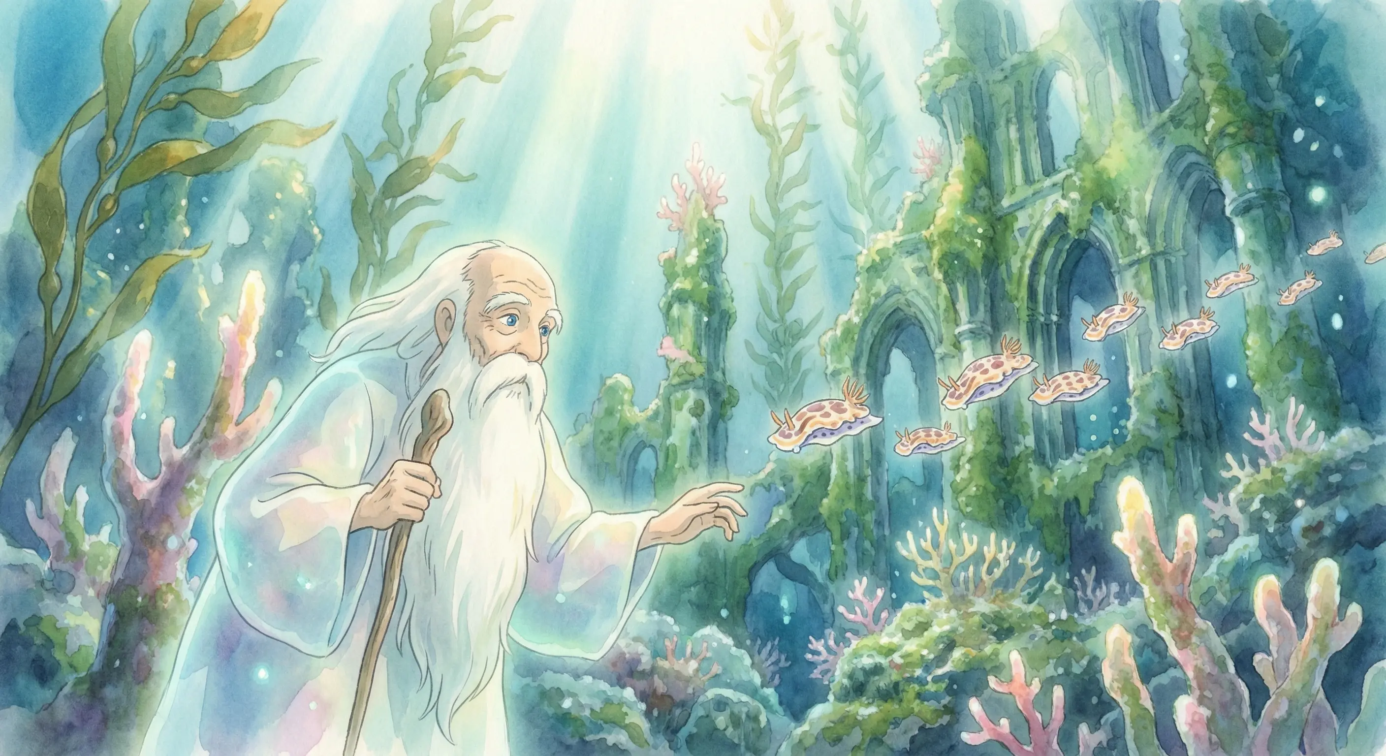 Anime Style: Ghibli-inspired Watercolor anime style. An ethereal Pietro Brollo guiding sea slugs through a coral cathedral. Character: A gentle, wizened man with flowing white robes, slightly translucent and glowing softly. Background: A lush, bioluminescent coral reef teeming with Phyllidiopsis shireenae (sea slugs), light filtering down like a cathedral. Technical: Wide shot showing vastness., Soft focus, god rays, gentle swaying animation feel.