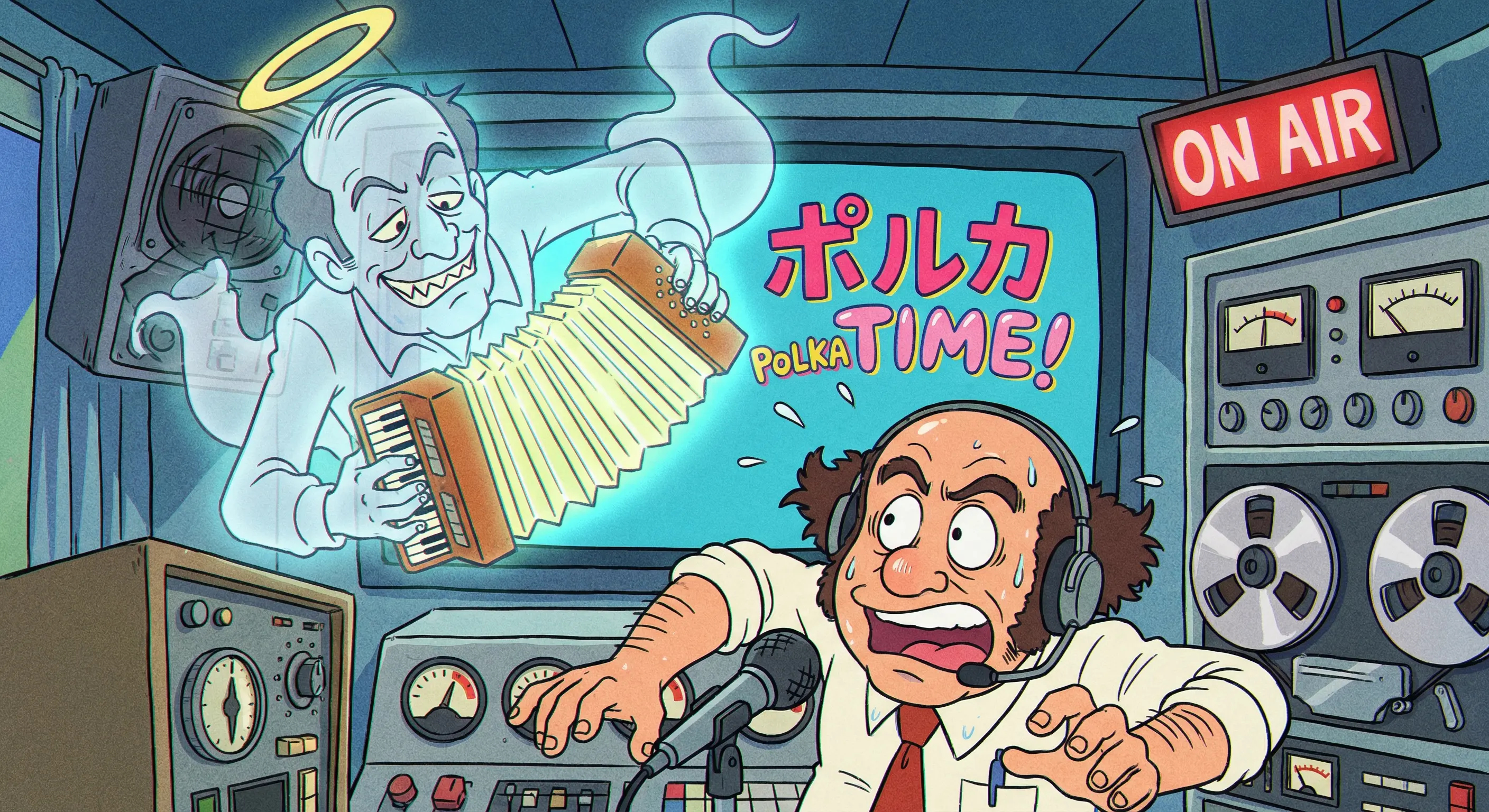 Anime Style: Retro 1970s Anime style. A mischievous ghost disrupting a news broadcast with polka music. Character: A cartoonish, spectral man with a halo askew and a devilish grin holding a spectral accordion. Background: A cluttered vintage radio station control room with a frantic news anchor. Technical: Dynamic, exaggerated pose., Wobbly animation lines, grainy texture, bright saturated colors.