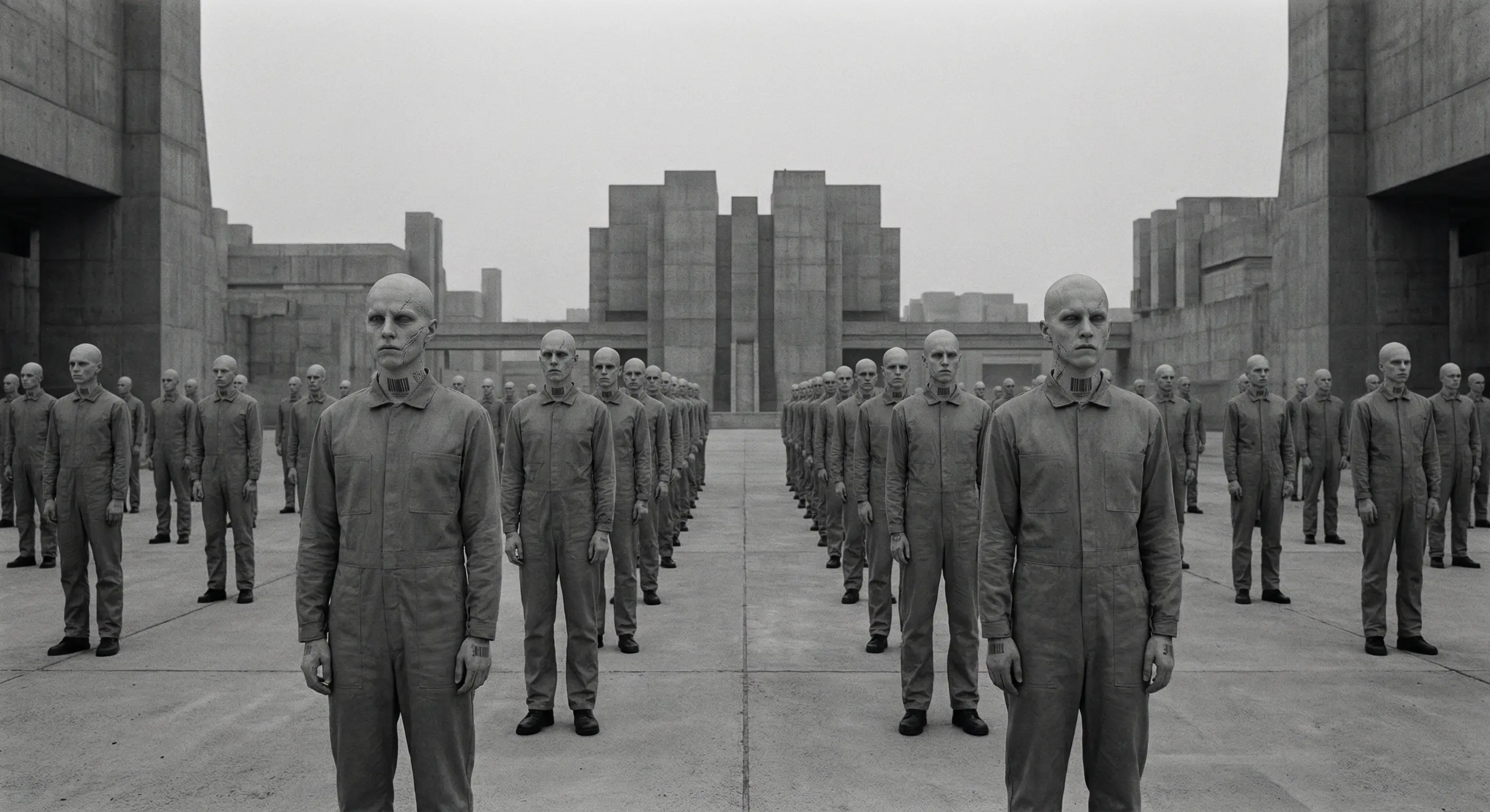 "description": "A group of androgynous figures with shaved heads and barcode tattoos, dressed in identical grey jumpsuits.",